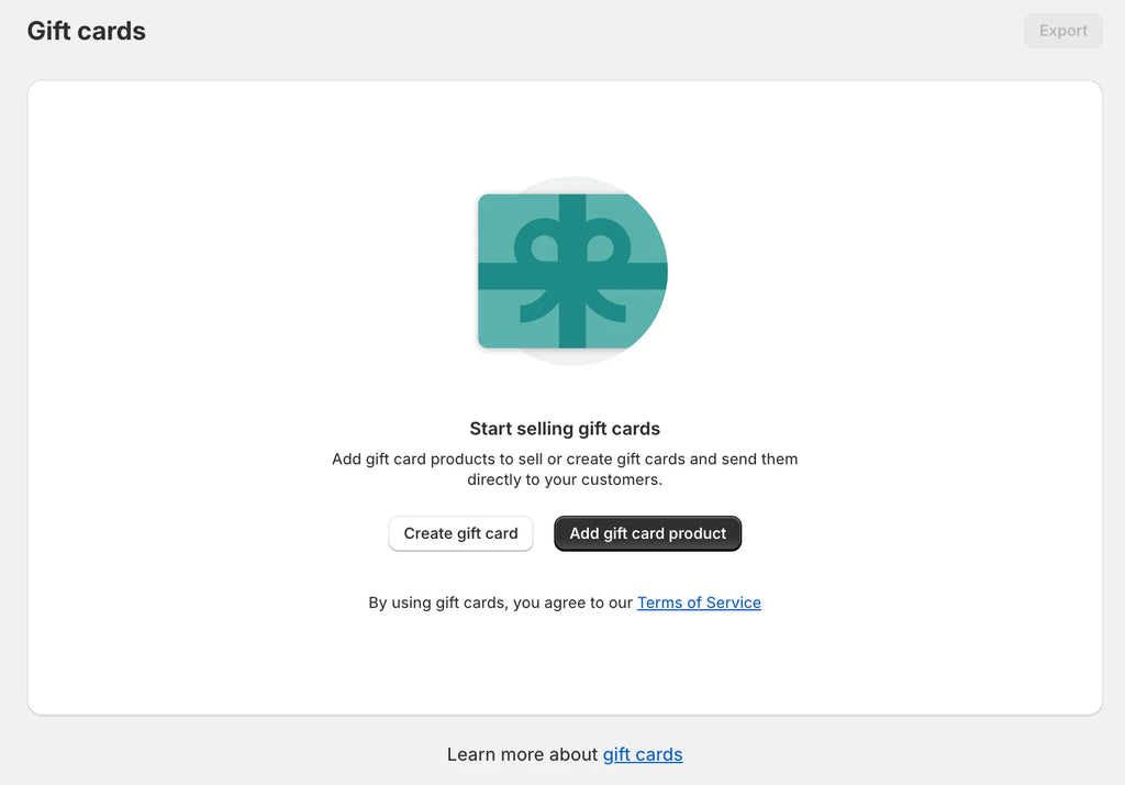Als je een cadeaubon wilt maken en publiceren, zodat klanten deze kunnen kopen, ga je naar Gift cards. Klik op Add a gift card product. Je kunt een cadeaubonproduct slechts één keer toevoegen.